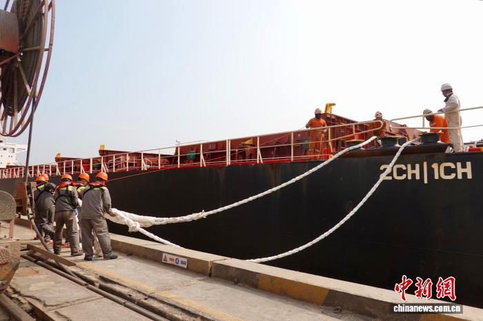 4月9日,船埠工人取海员合作靠停系缆。中新社记者 刘子琳 摄